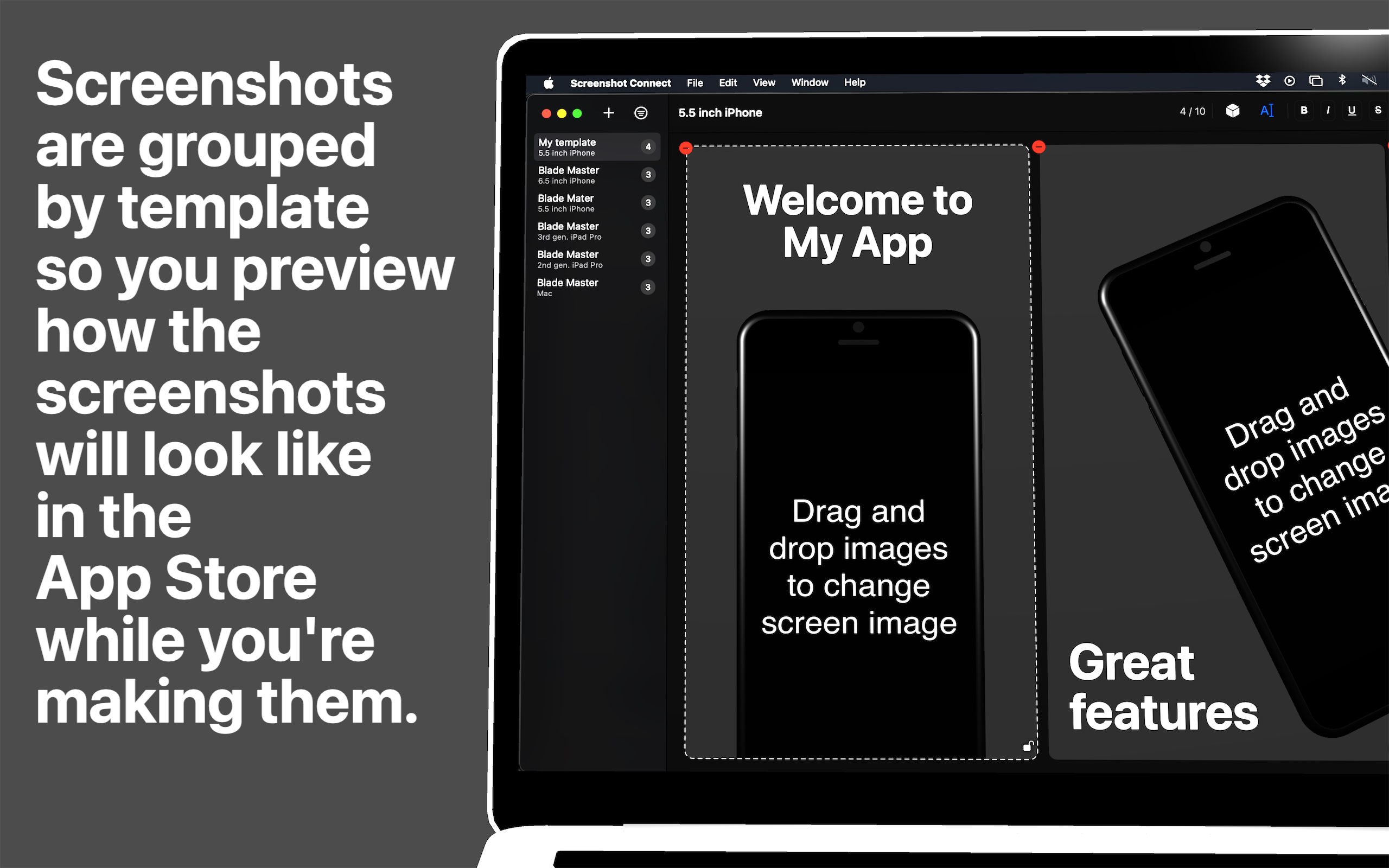 Screenshots are grouped by template so you preview how the screenshots will look like in the App Store while conceiving them.