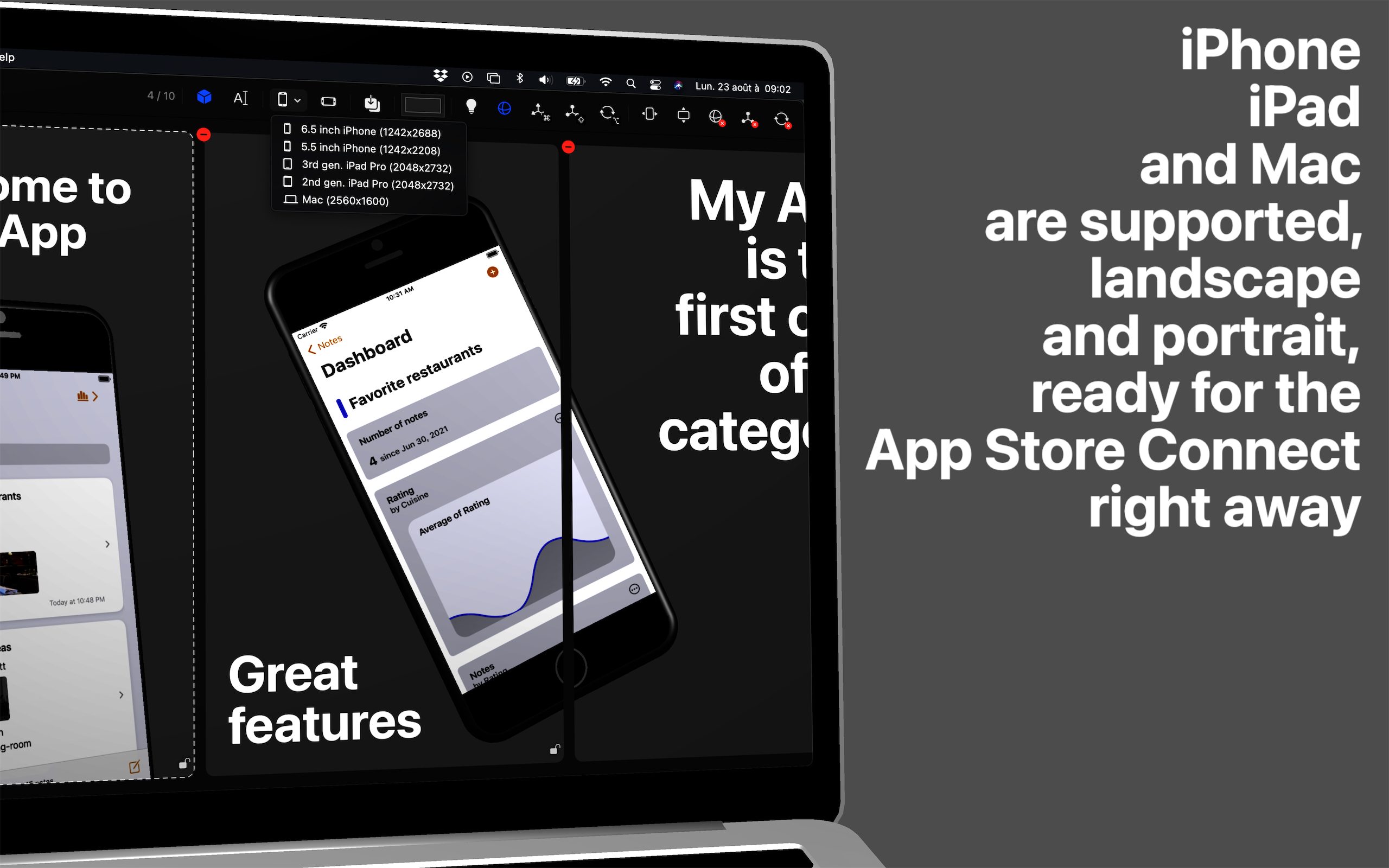 6.5 inch iPhone, 5.5 inch iPhone, 3rd gen iPad Pro, 2nd gen iPad Pro and Mac are supported, landscape and portrait.